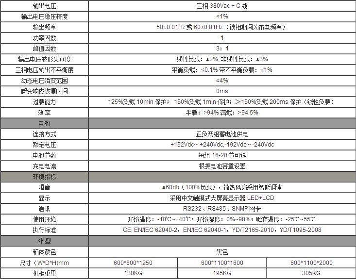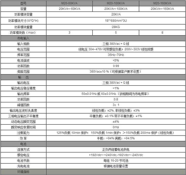M25系列UPS单机功率范围在20KVA-160KVA之间,是符合市场需求所推出的高可靠机型,该机型除秉承了原有高可靠性的技术优势以外,***别在设备控制(微处理器总线控制方式)、系统监控软件上有了较大改进。其技术指标均通过到模块化标准的I类指标。且可多机并机。应用范围中大型数据机房、银行、证劵、通信网络中心、自动化生产线及其控制系统,大楼照明、道路交通照明、电力、工矿企业。 主要技术应用***点 节能环保:效率***高达95%,输入功率因素≈1,输入谐波电流小 ◆在线双变换技术,输出电压质量好 ◆分散控制技术:冗余性好,可靠性强 ◆虚拟阻抗技术:均流性能优异 ◆基于双的三相***立数字控制:带不平衡负载能力强,输出电压谐波小 ◆热拔插设计:完善在线自诊断功能,及高速通讯接口,在线维护方便。 技术参数: |